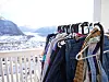 VOLDA: X2 Recycle-gjengen sitter på terassen i solsteken og gjør siste innspurt før festivalen starter. Logoen skal sys på klærne og prisene skal bestemmes. Det ligger klær strødd overalt, på gulvet og på stativ.